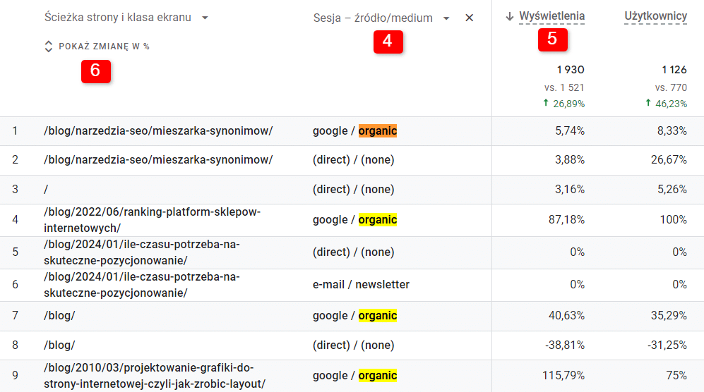 - Dla porządku w sekcji Ścieżka strony i klasa ekranu możesz kliknąć: Pokaż wszystkie wiersze i zmienić na: Pokaż zmianę w %.
