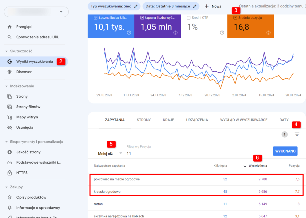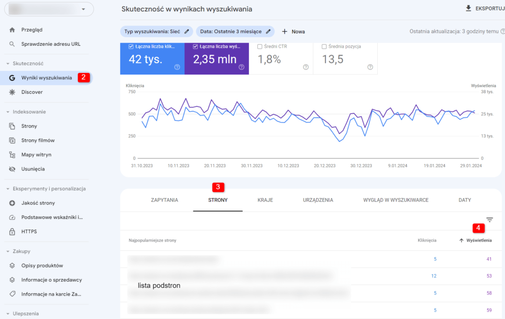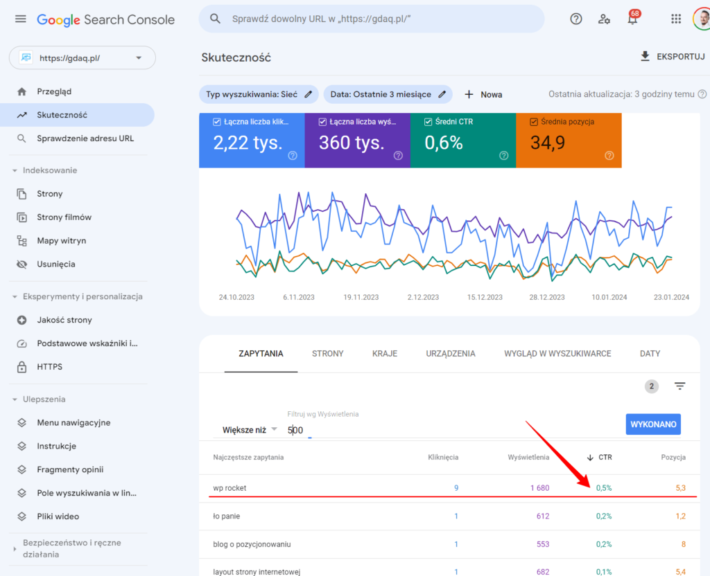 - Na głównym ekranie, na wykresie Skuteczność, kliknij po prawej: Pełny raport albo z lewego menu z sekcji Skuteczność kliknij: Wyniki wyszukiwania,