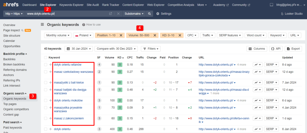 - Volume: 50-500 (frazy ze średnią miesięczną liczbą wyszukań 50-500),