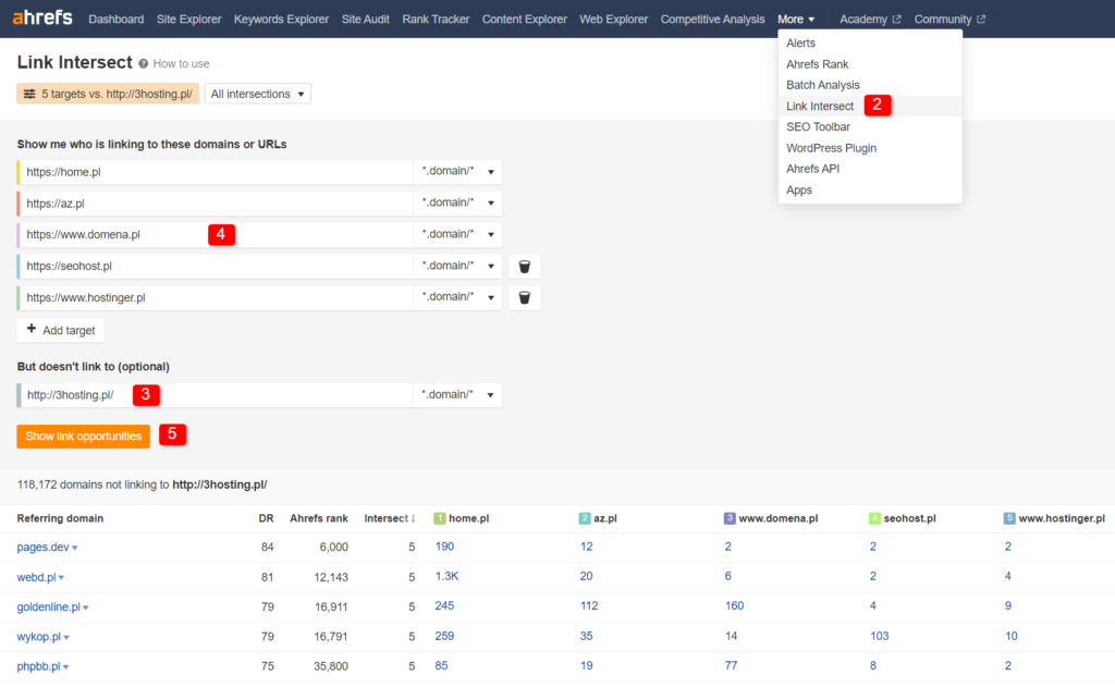 - W sekcji All intersections ja wybieram minimum 3 (czyli minimalnie trzech konkurentów rankuje na tę frazę, a moja strona nie).